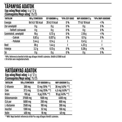 Glükomannán (Amorphophallus konjac), Étkezési sav (Citromsav), Maltodextrin, Édesítőszerek (Xilit, Szukralóz, Aceszulfám-K), Konjugált linolsav (CLA) por, Csomósodást gátló anyagok (Szilícium-dioxid, Kalcium-foszfátok), Színezék (Céklavörös), L-Glutamin, Aroma, Inozitol, Kolin-bitartarát, L-Aszkorbinsav, Cink-oxid, Króm pikolinát.