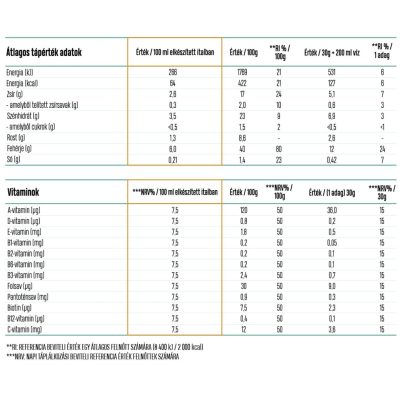 karamell), édesítőszerek (szukralóz, aceszulfám-K), csomósodást gátló anyag (kalcium-foszfátok), enzim komplex (0,1%) [maltodextrin, enzimek (alfa-amiláz, neutrális proteáz, laktáz, lipáz, celluláz)], vitaminok (C-vitamin: L-aszkorbinsav, niacin: nikotinamid, E-vitamin: DL-alfa-tokoferil[1]acetát, pantoténsav: kalcium-D-pantotenát, B6-vitamin: piridoxin-hidroklorid, B2-vitamin: riboflavin, B1-vitamin: tiamin[1]mononitrát, A-vitamin: retinil-acetát, folsav: pteroilmonoglutaminsav, biotin: D-biotin, D-vitamin: kolekalciferol, B12-vitamin: cianokobalamin), homoktövismagliszt, csipkebogyómagliszt