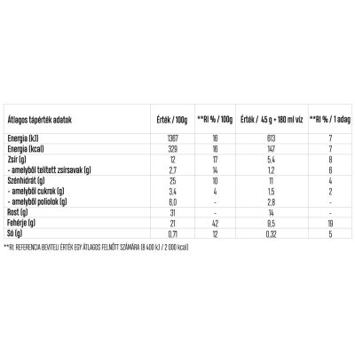Elkészítési javaslat:Adjon 45 g porhoz 180 ml vizet vagy növényi italt, majd jól keverje el. A sűrűbb állag eléréséhez hagyja állni 2-3 percet. Elkészítését vizzel ajánluk, mert vízzel is finom.