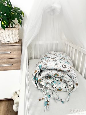A mackó pofik mintája nemcsak dekoratív, hanem segít a baba arcfelismerési készségének fejlődésében is – miközben egy kedves, ismerős közegben nőhet fel.
