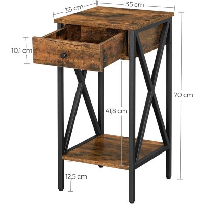 éjjeliszekrény, végasztal, magas éjjeliszekrény fiókkal és tárolópolccal, ipari, rusztikus barna és fekete: