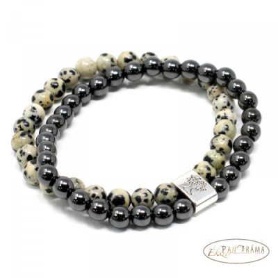 2 soros, magnetit és dalmata jáspis, amit egy ezüst színű, természetességet jelképező, fát ábrázoló szem fog össze!