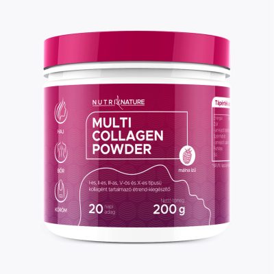 Málna ízű multi kollagén hidrolizált marha- és halkollagén, valamint tojáshéj membránból készült, öt különböző típusú kollagén (I., II., III., V., X.) kombinációját tartalmazza. Támogatja az ízületek, bőr, haj és köröm egészségét, és hozzájárul a porcok regenerálódásához. A termék könnyen oldódik és paleo-barát, napi adagja egyszerűen beépíthető az étrendbe.