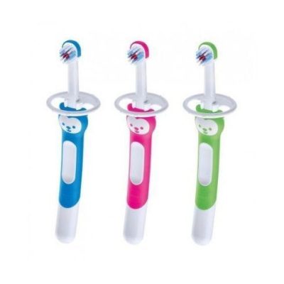 A biztonsági pajzs biztonságos távolságban tartja a kefét a baba szájüregének hátsó részétől.
