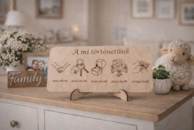 Meséld el szerelmetek történetét egy igazán különleges, gravírozott "Mi történetünk" táblával! Ez a dekorációs elem egyedi módon mutatja be kapcsolatotok fontos állomásait – az első találkozástól az eljegyzésen át egészen az esküvő napjáig és még azon is túl. Egy ilyen tábla nemcsak a vendégek szívét dobogtatja meg, de remek beszélgetésindító is lehet. Gravírozott fa kivitelben készül, személyre szabható dátumokkal és eseményekkel. Stílusos, elegáns és örök emlék, akár otthoni dekorációként is megállja a helyét.