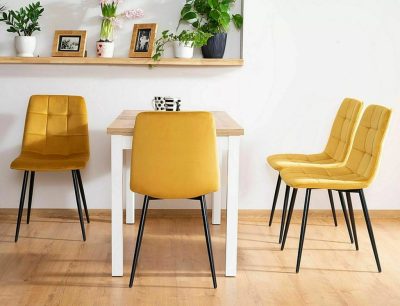 A Mila Velvet étkezőszék a modern design és a kényelem tökéletes ötvözete. A curry színű bársony kárpitozás luxus megjelenést kölcsönöz, míg a fekete matt fém lábak stabil alapot biztosítanak. A szék háttámlája és ülőfelülete steppelt kialakítású, ami nem csak esztétikus, de kényelmes is. A karcsú, 45 cm széles kialakítás lehetővé teszi, hogy kisebb terekbe is tökéletesen illeszkedjen.