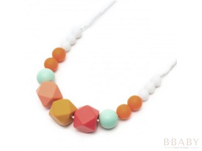 A Kenzo változat merész és friss árnyalatokat vonultat fel: mustár, korall, narancs, menta és fehér szilikon gyöngyei kellemes látványt nyújtanak a szülőnek és figyelemfelkeltők a babának. A nyaklánc 100% élelmiszeripari minőségű szilikonból készül, így teljesen biztonságosan használható rágókaként is – különösen a fogzási időszakban.