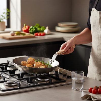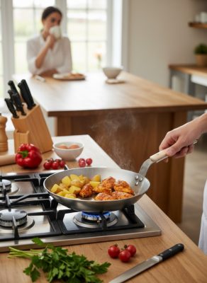 • Lyonnaise forma: A serpenyő oldala magas, kiszélesedő és lekerekített, éles szögek nélkül. Ez a forma megkönnyíti az étel kiöntését a serpenyőből.