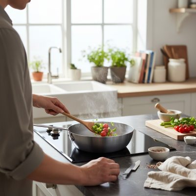 • Első használat előtt: Mossa el a serpenyőt forró vízzel és szappannal, majd alaposan szárítsa meg. Ezután kenje be vékonyan növényi olajjal, és hevítse fel, amíg enyhén füstölni nem kezd. Hagyja kihűlni, majd törölje ki az olajat. Ezt a folyamatot "beavatásnak" nevezik, és fontos a serpenyő megfelelő használatához.