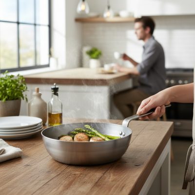• Kényelmes használat: A fül biztonságos és kényelmes fogást biztosít. A serpenyő könnyen felemelhető és mozgatható.