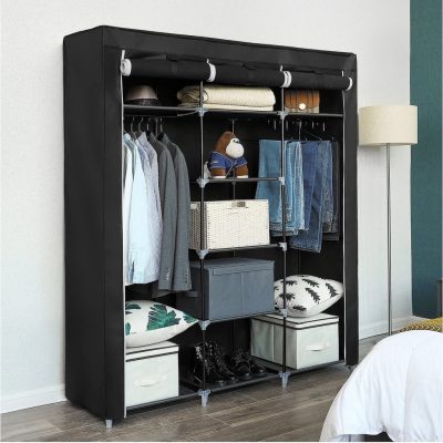 Mobil gardrób,szövetszekrény, összecsukható gardrób függesztő sínnel, fekete |
