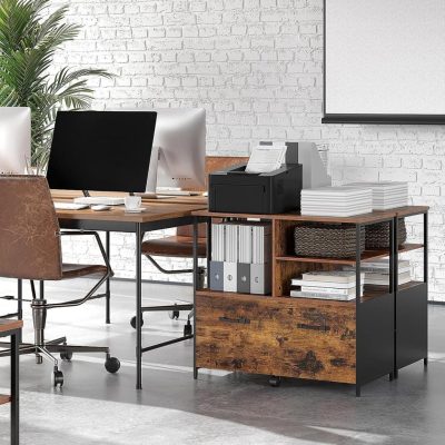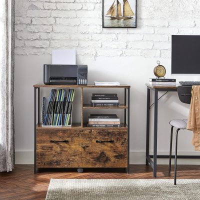 iratszekrény, irodai szekrény fiókkal és nyitott rekeszekkel, DIN A4-es dokumentumokhoz, levél formátumban, nyomtatóállvány, függő iratszekrény, ipari kivitel, vintage barna-fekete