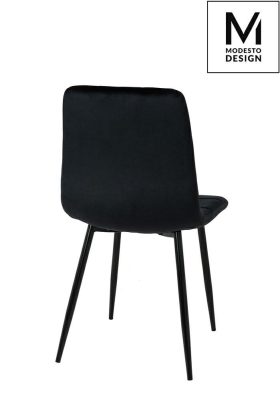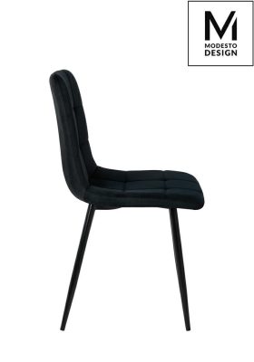 A Modesto Design Carlo szék a modern dizájn és a praktikus kényelem tökéletes ötvözete. A fekete bársony kárpitozás és a steppelt mintázat luxus megjelenést kölcsönöz, míg az ergonomikus kialakítás maximális kényelmet biztosít. A karcsú, fekete fémlábak stabil alapot nyújtanak és harmonikusan illeszkednek a szék összképéhez.