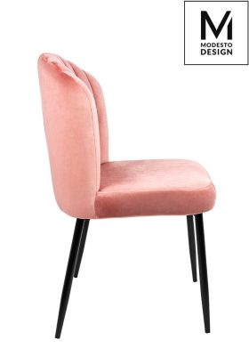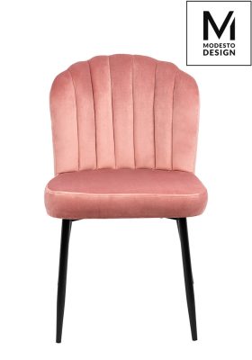 A Modesto Design Rango szék tökéletesen ötvözi a retro dizájnt a modern kényelemmel. A szék háttámláján látható függőleges varrások és a kagylóforma kialakítás az 50-es évek stílusát idézi. A puha, rózsaszín bársony kárpitozás és a karcsú fekete fémlábak elegáns kontrasztot alkotnak.