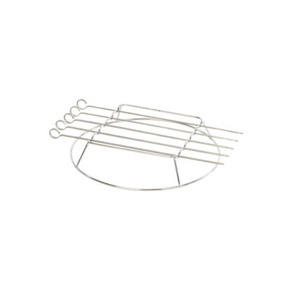 A szett továbbá tartalmaz egy kör alakú rozsdamentes tartót, amelyet a grillrácsra lehet helyezni, és amelyekbe a nyársakat lehet beleilleszteni. Ez a tartó kényelmesen és stabilan tartja a nyársakat, így azok nem csúszkálnak el vagy nem forognak el a grillezés során.
