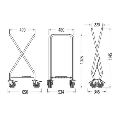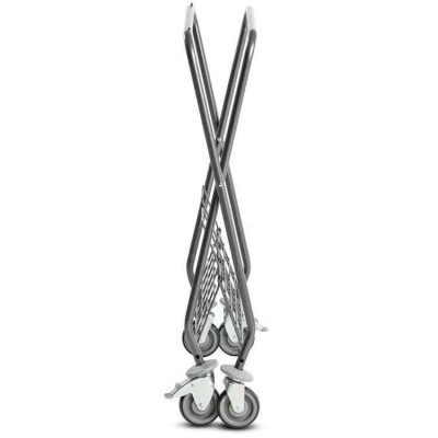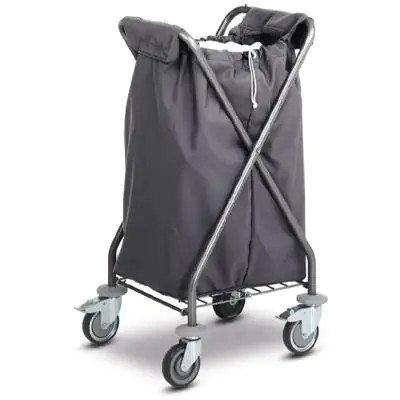 SW 145 szennyes ruha szállító kocsi színes zsákokkal. X lábú, összecsukható. Erős acélcső váz. 4 bolygó kerék.