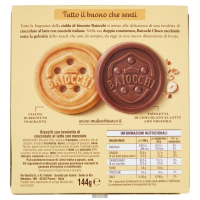 A Mulino Bianco Baiocchi Choco egy ínycsiklandó olasz édesség, amely két ropogós kekszréteg között gazdag csokoládékrémet rejt. Az egyedi receptúra és a minőségi alapanyagok gondoskodnak arról, hogy minden falat egy finom és felejthetetlen élményt nyújtson.