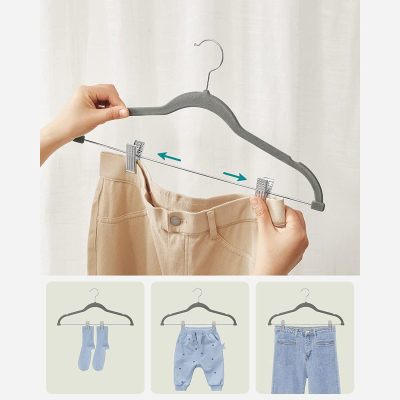 • [Mozgatható kapcsok] A 2 kapocs közötti szélesség állítható (max. 38 cm), így ezek a vállfák tökéletesek különböző méretű nadrágokhoz és szoknyákhoz;a kapcsok végén lévő gumipárnák megakadályozzák a ruhák elcsúszását anélkül, hogy megsérülnének