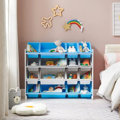 játéktároló egység, 4 szintes nagy játékrendező gyerekeknek 16 kivehető műanyag tárolóval, gyerekszobába, játszószobába, nappaliba, fehér, kék és szürke