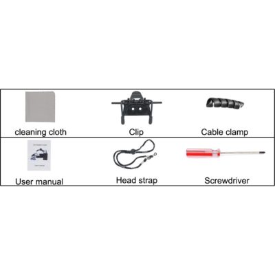 NEM tartalmazza a fejlámpát, csak a szemüveget és a nagyítót. A csomagban található egy klipsz, egy csavarhúzó, egy kábelrögzítő és egy fejpánt.