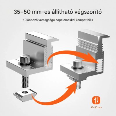 Ez a 40 darabos napelem végrögzítő készlet ideális megoldást kínál a napelemes panelek biztonságos és tartós rögzítéséhez. Az állítható kialakításnak köszönhetően a bilincsek 35–50 mm vastagságú napelemekhez is tökéletesen illeszkednek, így széles körben alkalmazhatók különböző rendszerekben.