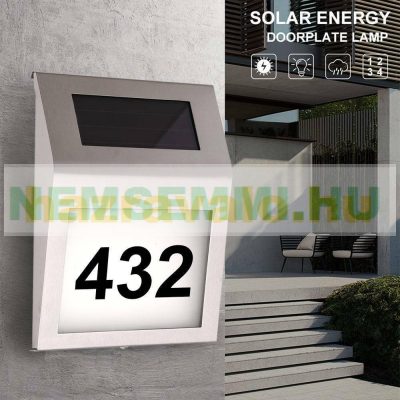 Napelemes lámpa világító házszám kis méretben kültéri kivitel, lapos forma, rozsdamentes acél 2 db LED világítás