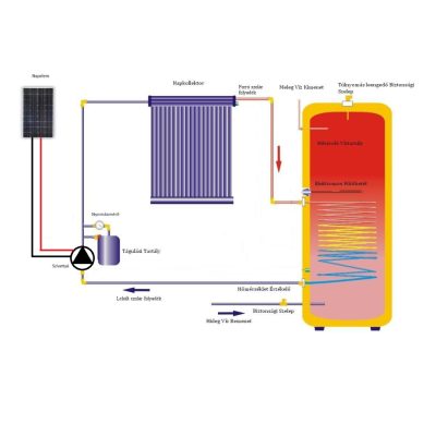 Szerelje déli irányba, 45-50 fokos meredek szögben a napkollektort és mellé a napelemet. A napkollektor felső kivezetését kösse össze a bojler felső hőcserélőjével, az alsót az alsóval. A magasságkülönbség ne legyen nagyobb, mint 2 méter, a távolság a kettő között lehetőleg ne legyen hosszabb, mint 5 méter. A bojler alsó hőcserélője és a síkkollektor alsó kivezetése közé szereljen be 2 db T idomot és mellé a szivattyút, arra kösse rá a napelemet. Helyes folyásirány a szivattyúnál a tároló felöl a napkollektor felé.