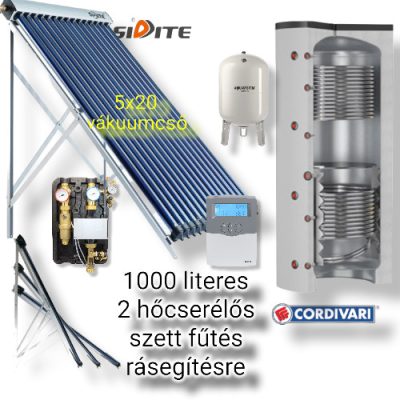 • Napkollektor rendszer Cordivari 1000 literes puffer fűtés rásegítésre: 5x20 vákuumcsöves kollektor + 2 hőcserélős puffertároló + nagyteljesítményű szivattyú állomás + vezérlés + tágulási tartály