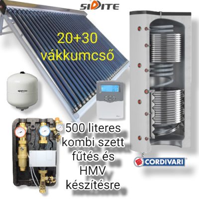 Ez a csomagunk 1db 30 csöves és 1 db 20 csöves vákuumcsöves napkollektort, minőségi vezérléssel , nagy teljesítményű szivattyú állomással, 50 literes tágulási tartállyal és 3 hőcserélős Cordivari Eco-Combi 500 liter 1 inox és 2 acél hőcserélős puffer tárolóval szállítjuk.
