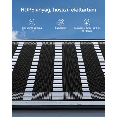 A panelek strapabíró HDPE anyagból készültek, amely ellenáll az UV-sugárzásnak, a vegyszereknek és a kültéri környezet hatásainak. Ez biztosítja a hosszú élettartamot és a megbízható működést akár intenzív használat mellett is.