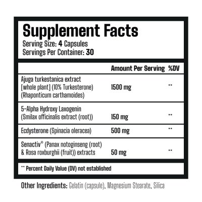 1500mg Turkesterone (standardized 10% Ajuga Turkestenica extract): Megadózisban, a sokaknál bizonyított standardizált Turkesterone kivonat (10%) melyet az Orosz és Üzbég testépítők közül sokan az egyik legerősebb természetes izomépítő hatóanyagnak tartanak. Hatékonyan fokozza a fehérjeszintézist, azaz a fehérjéknek az izmokban történő felhasznosulását. Emellett blokkolja a Miosztatin gént, így eredményezve több Follistatin Növekedési Faktor kialakulását. A Miosztatin egy gén amely leszabályozza az izomszövetek növekedését, míg a Follistatin egy olyan növekedési faktor amely elősegíti az izomszövetek növekedését. Ráadásul fokozza a libidót, az energiaszintézist, és férfiak esetében még a tesztoszteron termelését is. Ezen túl komoly immunerősítő hatással is bír, és jótékony hatással van a szív és érrendszerre is. Teljesen mellékhatás-mentes és Nők számára nem okoz férfiasodást, hormoningadozást sem.