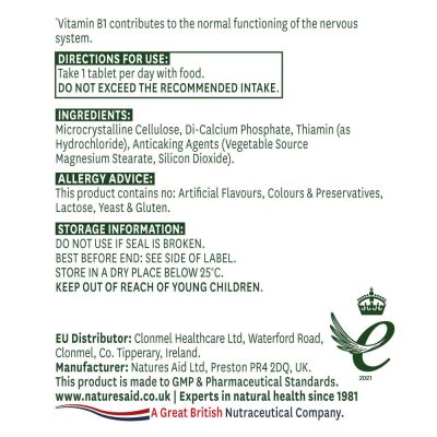 A Natures Aid B1-vitamin minden tablettája 100 mg B1-vitamint biztosít azokra az időszakokra, amikor úgy érzi, hogy étrendje nem biztosítja a szervezet számára szükséges szintet.