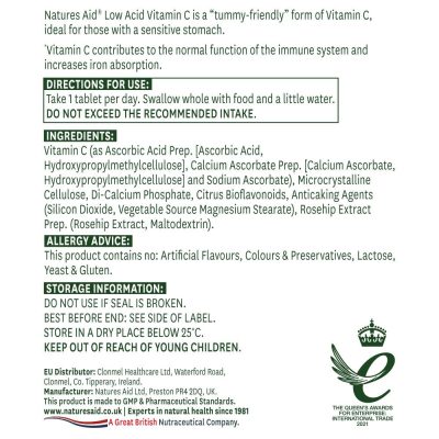 A Natures Aid alacsony savtartalmú 1000 mg-os C-vitamin tablettákban az aszkorbinsavat a C-vitamin kíméletesebb formáival, például kalcium-aszkorbáttal és nátrium-aszkorbáttal kombinálták, olyan terméket létrehozva, amely gyengéd a gyomornak, miközben tablettánként 1000 mg C-vitamint tartalmaz.