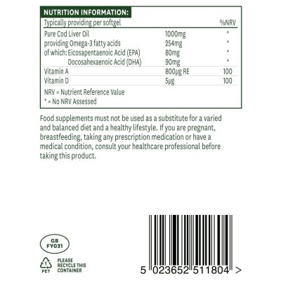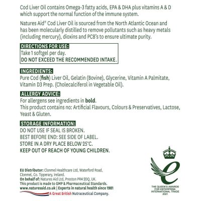 A Natures Aid nagy erősségű, 1000 mg-os csukamájolaj kapszuláinak mindegyike A-vitamin, D-vitamin és omega-3 zsírsavak forrása, beleértve a DHA-t és az EPA-t.