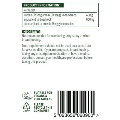 A Natures Aid Korean ginseng tabletta 40 mg koreai ginzeng kivonatot tartalmaz, ami azt jelenti, hogy minden adag hatóanyag tartalma megfelel 600 mg szárított koreai ginzeng gyökerének.