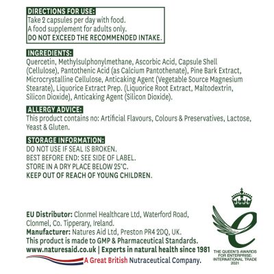A Natures Aid Quercetin Formula vegánok számára is fogyasztható, valamint laktóz-, búza- és gluténmentes.