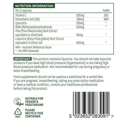 Hatóanyag tartalom napi adagban: 2 kapszula tartalmaz: 200 mg C-vitamin, 100 mg pantoténsav (B5-vitamin), 250 mg quercetin, 250 mg MSM (metil-szulfonil-metán), 50 mg fenyőkéreg kivonat szárított kéreg egyenértéke, 250 mg édesgyökér kivonat szárított gyökér egyenértéke.