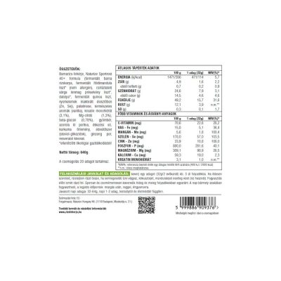 sárga lenmag préselvény liszt*, datolya*, fermentált quinoa liszt, nyomelemek inaktivált élesztőben (Zn, Se)), palatinose, természetes aromák (vanília), kreatin monohidrát (3,1%), Mg-citrát (1,3%), beta-glucan (0,78%), gyömbér, acerola lé porítva, étkezési só, kurkuma őrlemény, édesítőszer (steviol-glikozidok), ginzeng por, resveratol kivonat.