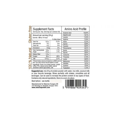 Kizárólag teljes, csíráztatott barna rizsszemek felhasználásával készül, természetes, vegyszermentes eljárással. Előállítása során a teljes rizsszemet előbb csíráztatják, majd annak mindhárom részét felhasználják, így teljesértékű, mind a 9 esszenciális aminosavat tartalmazó, fehérjepor keletkezik.