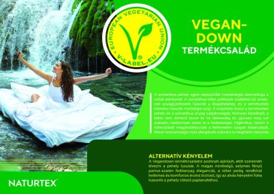 A Vegandown termékcsaládot azoknak ajánljuk, akik szeretnék élvezni a pehely luxusát. A magas minőségű, selymes fényű pamut-szatén fedőanyag eleganciát, a töltet pedig rendkívül kellemes és komfortos érzést biztosít, így az alvás kényelmi foka hasonló a pehely töltetű ágyneműkéhez.