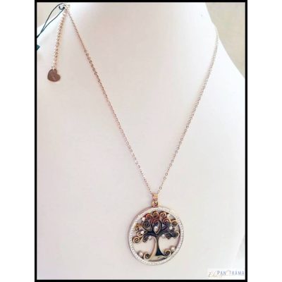 Acél női nyaklánc, arany bevonattal, ami rendkívül mutatós 35 mm kerek medállal, amit apró gyönyörűen csillogó kristályok díszítenek, közepén egy fa, amiben kicsit nagyobb kristályok díszlenek.