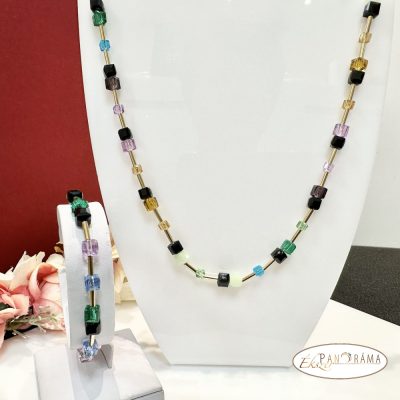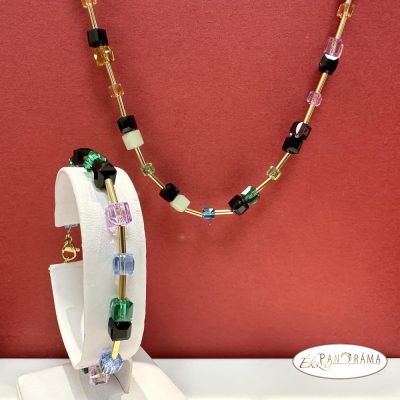 Nemesacél 14K aranyozott, finom kidolgozású nyaklánc és karkötő szett, színes gyöngyökkel díszítve