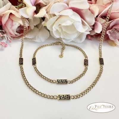Kerek szemes arany színű szett, tégla lap alakú betétetkkel, görög minta díszítéssel. Tökéletes kiegészítője lehet öltözetünknek.