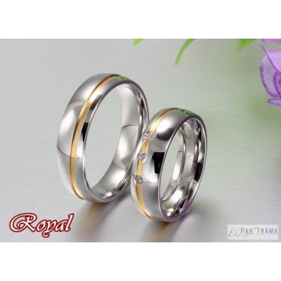 Nemes acél férfi karika gyűrű ezüst színben, vékony arany díszítéssel a gyűrű teljes kerületén kicsit átlósan. A női méretben kővel kapható!