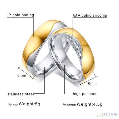 Nemes acél férfi karika gyűrű ezüst színben, arany díszítéssel . A női méretben kristályos díszítéssel kapható!
