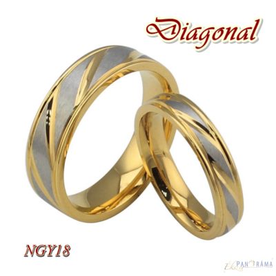 Nemes acél karika gyűrű arany bevonattal, átlósan az ezüst alap dominál. 2 féle szélességben kapható, 4 ill. 6mm.