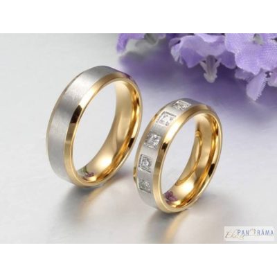 Nemes acél női karika gyűrű ezüst színben, vékony arany díszítéssel a két szélén. A női méretben 5 kővel kapható!