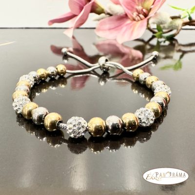 Acél karkötő, állítható mérettel, mágneses csúszózárral, csillogó shamballa kristály és arany-ezüst gyöngyök kombinációjával.