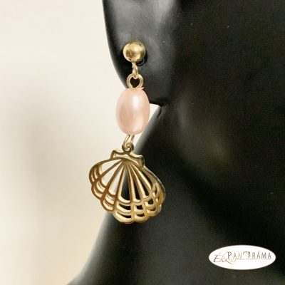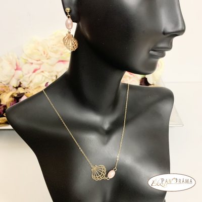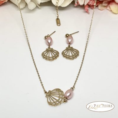 Nemesacél, arany színű, nyaklánc és fülbevaló szett kagyló és egy rózsaszín gyöngy díszítéssel. Kifinomult, ízléses darab, a szolíd elegáns ékszereket kedvelőknek