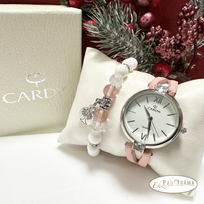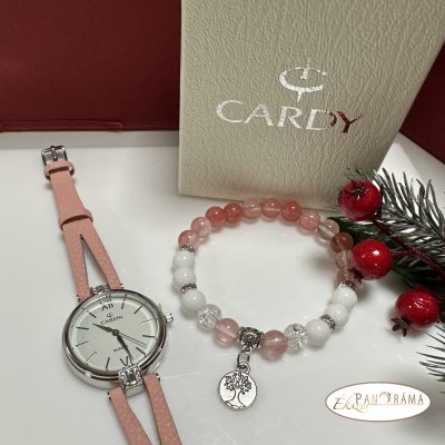 Igényes Cardy karóra, ezüst színű tokkal, rózsaszín szíjjal, mellé órakísérő ásvány karkötő életfa medál díszítéssel, mindez Cardy díszdobozban!